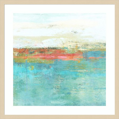 This image depicts a modern, abstract landscape painting characterized by vibrant colors and heavy textural elements. The composition includes a mix of turquoise, blue, and teal shades in the foreground, transitioning to earthy tones of green, beige, and highlights of red and pink in the midground. The textured, blended brushstrokes create an impressionistic view of a serene, coastal scene reminiscent of water and sky, emphasizing the horizontal lines and the horizon, giving a sense of space and tranquility. This framed art print was created by Suzanne Nicoll and printed by Amanti Art in Madison WI. The print is giclee printed using fade-resistant inks for picture-perfect detail and incredible depth of color and finished with a 100% real wood frame. Individually made using traditional custom framing techniques, it has the quality you would expect from your local frame shop.