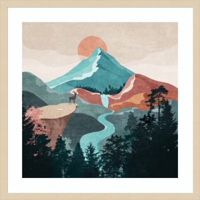 The artwork features a vibrant tropical scene with various green plants set against a backdrop of an ocean and a bright orange sun. A terracotta-colored terrace steps up from the foreground, adding warmth to the setting. The minimalist style and bold colors evoke a sense of tranquility and summer. This framed art print was created by Kristian Gallagher and printed by Amanti Art in Madison WI. The print is giclee printed using fade-resistant inks for picture-perfect detail and incredible depth of color and finished with a 100% real wood frame. Individually made using traditional custom framing techniques, it has the quality you would expect from your local frame shop.