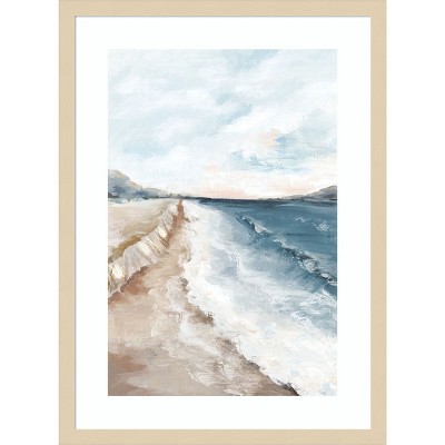 This image features a serene and abstract seascape. The scene captures a vast, tranquil ocean meeting a sandy shore. Soft, muted colors and a focus on pastels create a calming and peaceful atmosphere, with a landscape that hints at horizon lines blending into the sky. The impressionistic style provides a minimalist yet evocative interpretation of a coastal view. This framed art print was created by Urban Road and printed by Amanti Art in Madison WI. The print is giclee printed using fade-resistant inks for picture-perfect detail and incredible depth of color and finished with a 100% real wood frame. Individually made using traditional custom framing techniques, it has the quality you would expect from your local frame shop.