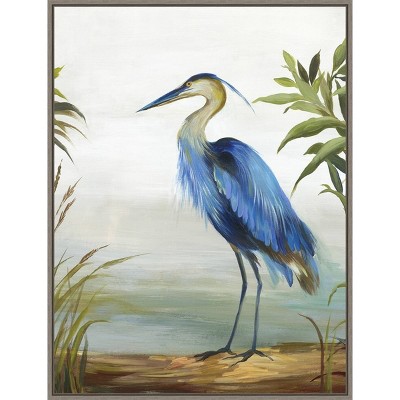 This painting features a majestic blue heron standing in profile on the banks of a body of water. Is he looking at his next meal or his true love? We do not know, but the plants have parted, making a space for him as he decides what to do next. This canvas art print was created by Aimee Wilson and printed in Madison, WI. It is stretched across a solid surface to resist sagging. We use only premium, high-tension canvas. Our exclusive stretching techniques hide corner folds and provide a taut canvas surface. The artwork is authentically licensed. The canvas appears as if it is floating in the frame because it has a narrow gap between the edge of the canvas and the frame. Our canvas items are individually made using traditional custom framing techniques, it has the quality you would expect from your local frame shop.