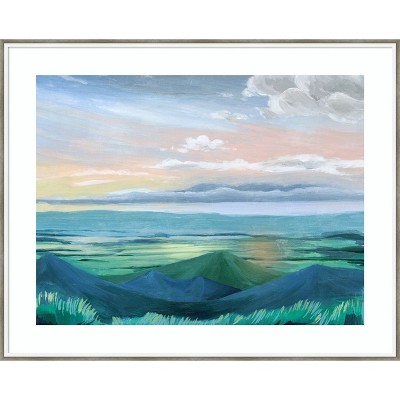 The image depicts a tranquil landscape featuring gentle rolling hills with varying shades of green. Soft clouds drift across the sky above, creating a serene and expansive atmosphere. The overall composition evokes a sense of calm and harmony with nature. This framed art print was created by Grace Popp and printed by Amanti Art in Madison WI. The print is giclee printed using fade-resistant inks for picture-perfect detail and incredible depth of color and finished with a 100% real wood frame. Individually made using traditional custom framing techniques, it has the quality you would expect from your local frame shop.