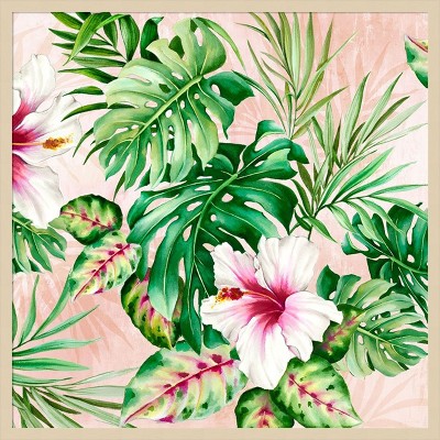 The artwork features large, vibrant tropical leaves in rich shades of green, blue, and hints of peach. The leaves are layered against a soft background, creating a striking contrast. The painting captures the lushness and vitality of botanical forms. This canvas art print was created by Alex Black and printed in Waunakee, WI. It is stretched across a solid surface to resist sagging. We use only premium, high-tension canvas. Our exclusive stretching techniques hide corner folds and provide a taut canvas surface. The artwork is authentically licensed. The canvas appears as if it is floating in the frame because it has a narrow gap between the edge of the canvas and the frame. Our canvas items are individually made using traditional custom framing techniques, it has the quality you would expect from your local frame shop.