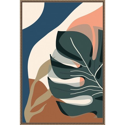 The artwork features a minimalist botanical design with bold, abstract plant shapes set against a backdrop of earthy, geometric forms. The color palette is a harmonious blend of muted tones, including green, brown, and blue. Simple lines add an organic touch to the composition, creating a modern and serene feel. This canvas art print was created by Arctic Frame and printed in Waunakee, WI. It is stretched across a solid surface to resist sagging. We use only premium, high-tension canvas. Our exclusive stretching techniques hide corner folds and provide a taut canvas surface. The artwork is authentically licensed. The canvas appears as if it is floating in the frame because it has a narrow gap between the edge of the canvas and the frame. Our canvas items are individually made using traditional custom framing techniques, it has the quality you would expect from your local frame shop.