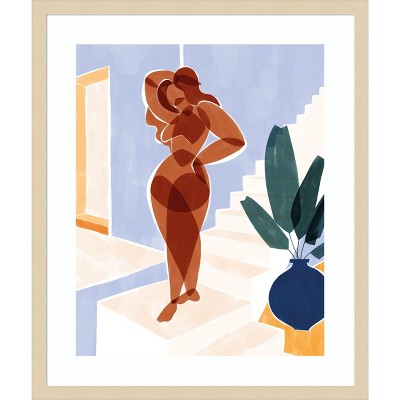This artwork features a vibrant sun in the upper part, painted in bright yellows and oranges. Dark green leaves and a branch create a bold contrast against the warm-toned background of orange, pink, and yellow. The piece employs a modern abstract style with simplified forms and a striking color palette. This framed art print was created by Walker Noble and printed by Amanti Art in Madison WI. The print is giclee printed using fade-resistant inks for picture-perfect detail and incredible depth of color and finished with a 100% real wood frame. Individually made using traditional custom framing techniques, it has the quality you would expect from your local frame shop.