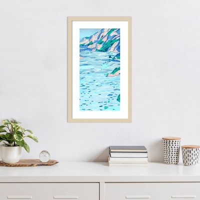 The artwork features a dynamic interplay of blues, greens, and yellows, evoking the shimmering reflection of light on water. Brushstrokes create a sense of movement and fluidity, with abstract patterns suggesting natural elements. The composition captures an impressionistic view, blending color and texture to invoke a serene, yet vibrant atmosphere. This framed art print was created by Melissa Wang and printed by Amanti Art in Madison WI. The print is giclee printed using fade-resistant inks for picture-perfect detail and incredible depth of color and finished with a 100% real wood frame. Individually made using traditional custom framing techniques, it has the quality you would expect from your local frame shop.