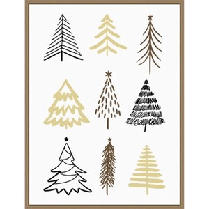 This image features nine abstract and minimalist line drawings of Christmas trees. Each tree has a unique design with different shapes and styles, utilizing brown and gold tones on a white background. Some trees are adorned with stars at the top, while others emphasize simple, geometric forms. The artwork presents a modern and festive holiday theme suitable for various decorative purposes. This canvas art print was created by Kristina N. and printed in Waunakee, WI. It is stretched across a solid surface to resist sagging. We use only premium, high-tension canvas. Our exclusive stretching techniques hide corner folds and provide a taut canvas surface. The artwork is authentically licensed. The canvas appears as if it is floating in the frame because it has a narrow gap between the edge of the canvas and the frame. Our canvas items are individually made using traditional custom framing techniques, it has the quality you would expect from your local frame shop.
