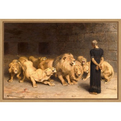This painting depicts a moment from the story of Daniel in the lion's den. Daniel stands in the pit, gazing toward a beam of light streaming through a window. Around him, the lions maintain their distance, pacing cautiously as they circle him. This canvas art print was created by Briton Riviere and printed in Madison, WI. It is stretched across a solid surface to resist sagging. We use only premium, high-tension canvas. Our exclusive stretching techniques hide corner folds and provide a taut canvas surface. The artwork is authentically licensed. The canvas appears as if it is floating in the frame because it has a narrow gap between the edge of the canvas and the frame. Our canvas items are individually made using traditional custom framing techniques, it has the quality you would expect from your local frame shop.