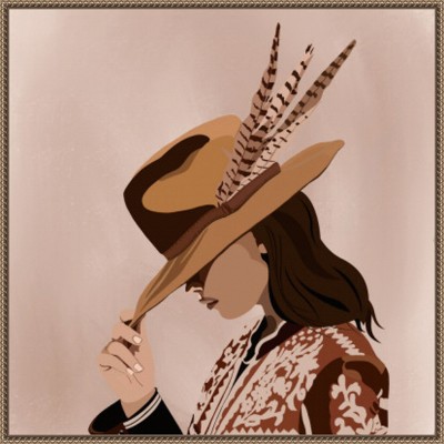 The artwork portrays a woman in a Western-style outfit with a detailed patterned jacket. She is wearing a wide-brimmed hat adorned with feathers, partially covering her face in a mysterious pose. The color palette features warm browns and muted tones, giving the piece a rustic and elegant feel. This canvas art print was created by Emel Tunaboylu and printed in Waunakee, WI. It is stretched across a solid surface to resist sagging. We use only premium, high-tension canvas. Our exclusive stretching techniques hide corner folds and provide a taut canvas surface. The artwork is authentically licensed. The canvas appears as if it is floating in the frame because it has a narrow gap between the edge of the canvas and the frame. Our canvas items are individually made using traditional custom framing techniques, it has the quality you would expect from your local frame shop.