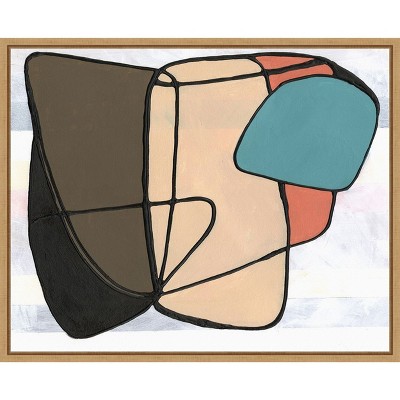 The artwork features an abstract composition with geometric shapes outlined in bold black lines. Earthy tones of brown and beige are contrasted with pops of teal and coral. The design is clean and minimalist, offering a modern aesthetic appeal. This framed art print was created by Vanna Lam and printed by Amanti Art in Madison WI. The print is giclee printed using fade-resistant inks for picture-perfect detail and incredible depth of color and finished with a 100% real wood frame. Individually made using traditional custom framing techniques, it has the quality you would expect from your local frame shop.