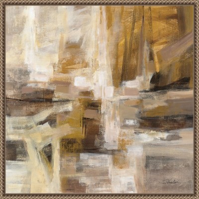The artwork features an intricate geometric pattern with interlocking shapes in metallic gold and gray hues. The interplay of lines and angles creates a sense of movement and depth. This modern abstract piece blends elegance and sophistication, ideal for contemporary spaces. This canvas art print was created by Melissa Wang and printed in Waunakee, WI. It is stretched across a solid surface to resist sagging. We use only premium, high-tension canvas. Our exclusive stretching techniques hide corner folds and provide a taut canvas surface. The artwork is authentically licensed. The canvas appears as if it is floating in the frame because it has a narrow gap between the edge of the canvas and the frame. Our canvas items are individually made using traditional custom framing techniques, it has the quality you would expect from your local frame shop.