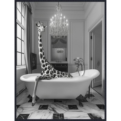 A giraffe playfully emerges from a bubble-filled bathtub, set against a backdrop of nature-themed wallpaper featuring delicate flowers and greenery. The scene combines whimsical elements with a blend of surreal and fantasy art styles. The image's playful charm invites viewers into a quirky, imaginative world. This canvas art print was created by Niky Rahner and printed in Waunakee, WI. It is stretched across a solid surface to resist sagging. We use only premium, high-tension canvas. Our exclusive stretching techniques hide corner folds and provide a taut canvas surface. The artwork is authentically licensed. The canvas appears as if it is floating in the frame because it has a narrow gap between the edge of the canvas and the frame. Our canvas items are individually made using traditional custom framing techniques, it has the quality you would expect from your local frame shop.