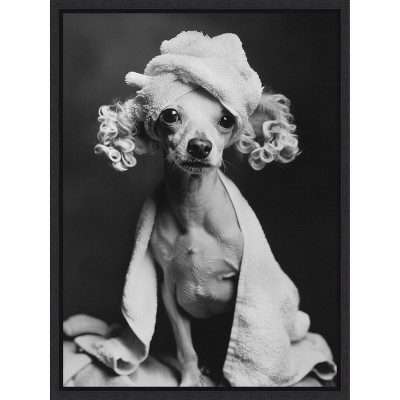 The image portrays a small dog sitting on a toilet while intently reading a book. The humorous setting is enhanced by the black-and-white style, giving it a classic yet whimsical feel. It's a charming scene that captures a quirky moment with a cute pet. This canvas art print was created by Niky Rahner and printed in Waunakee, WI. It is stretched across a solid surface to resist sagging. We use only premium, high-tension canvas. Our exclusive stretching techniques hide corner folds and provide a taut canvas surface. The artwork is authentically licensed. The canvas appears as if it is floating in the frame because it has a narrow gap between the edge of the canvas and the frame. Our canvas items are individually made using traditional custom framing techniques, it has the quality you would expect from your local frame shop.