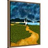 The artwork features two white birds standing on a grassy landscape against a backdrop of rolling mountains and a vast, cloudy sky. A meandering path cuts through the green terrain, leading toward a blue body of water beneath the setting sun. The scene evokes a sense of tranquility and natural beauty. This canvas art print was created by Uma Gokhale and printed in Waunakee, WI. It is stretched across a solid surface to resist sagging. We use only premium, high-tension canvas. Our exclusive stretching techniques hide corner folds and provide a taut canvas surface. The artwork is authentically licensed. The canvas appears as if it is floating in the frame because it has a narrow gap between the edge of the canvas and the frame. Our canvas items are individually made using traditional custom framing techniques, it has the quality you would expect from your local frame shop.