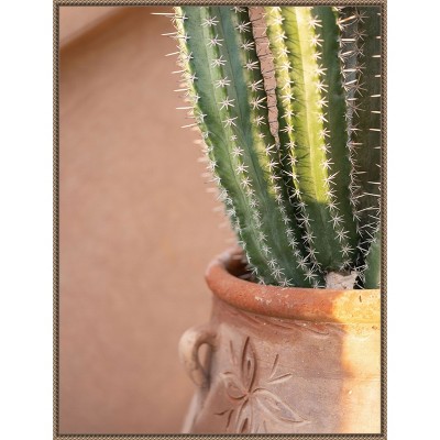 The image showcases a cactus with sharp spines growing in a decorative terracotta pot. The pot features subtle floral engravings and is bathed in warm sunlight. The green of the cactus contrasts against the earthy tones of the pot, creating a vibrant yet natural look. This framed art print was created by Raisa Zwart and printed by Amanti Art in Madison WI. The print is giclee printed using fade-resistant inks for picture-perfect detail and incredible depth of color and finished with a 100% real wood frame. Individually made using traditional custom framing techniques, it has the quality you would expect from your local frame shop.