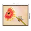A vivid green frog with striking orange eyes is perched on the stem of a large, colorful flower. The flower displays a gradient of warm colors, from soft yellow to deep pink. The backdrop is a creamy pastel shade, highlighting the natural beauty and whimsy of the scene. This canvas art print was created by PHBurchett and printed in Waunakee, WI. It is stretched across a solid surface to resist sagging. We use only premium, high-tension canvas. Our exclusive stretching techniques hide corner folds and provide a taut canvas surface. The artwork is authentically licensed. The canvas appears as if it is floating in the frame because it has a narrow gap between the edge of the canvas and the frame. Our canvas items are individually made using traditional custom framing techniques, it has the quality you would expect from your local frame shop.