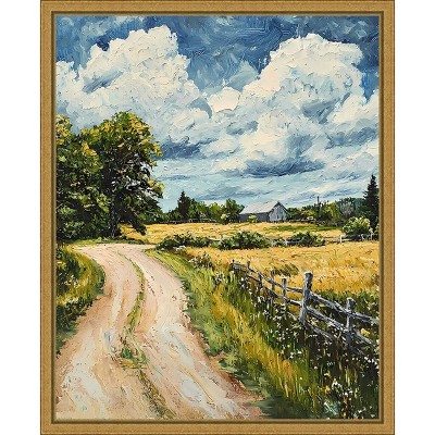 The artwork showcases a serene countryside scene with a winding dirt road leading through golden fields under a dramatic, cloud-filled sky. The road is flanked by vibrant greenery, and a rustic fence runs alongside it. In the background, lush trees and a small barn add to the idyllic rural setting. This canvas art print was created by Walker Noble and printed in Waunakee, WI. It is stretched across a solid surface to resist sagging. We use only premium, high-tension canvas. Our exclusive stretching techniques hide corner folds and provide a taut canvas surface. The artwork is authentically licensed. The canvas appears as if it is floating in the frame because it has a narrow gap between the edge of the canvas and the frame. Our canvas items are individually made using traditional custom framing techniques, it has the quality you would expect from your local frame shop.
