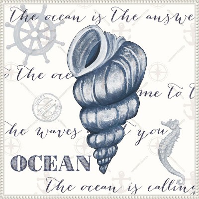 This artwork showcases a delicate seashell, carefully arranged against a backdrop of deep indigo accents. The artist\'s attention to detail and choice of color create a serene and captivating depiction of ocean treasures. This canvas art print was created by Gina Ritter and printed in Madison, WI. It is stretched across a solid surface to resist sagging. We use only premium, high-tension canvas. Our exclusive stretching techniques hide corner folds and provide a taut canvas surface. The artwork is authentically licensed. The canvas appears as if it is floating in the frame because it has a narrow gap between the edge of the canvas and the frame. Our canvas items are individually made using traditional custom framing techniques, it has the quality you would expect from your local frame shop.