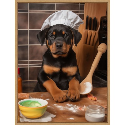 A small puppy dressed as a chef stands in a kitchen with its paw on a wooden spoon in a mixing bowl. The kitchen setting includes shelves with bowls and a stove in the background. The adorable scene is completed with a white chef hat and outfit on the puppy. This canvas art print was created by Andreas Magnusson and printed in Waunakee, WI. It is stretched across a solid surface to resist sagging. We use only premium, high-tension canvas. Our exclusive stretching techniques hide corner folds and provide a taut canvas surface. The artwork is authentically licensed. The canvas appears as if it is floating in the frame because it has a narrow gap between the edge of the canvas and the frame. Our canvas items are individually made using traditional custom framing techniques, it has the quality you would expect from your local frame shop.