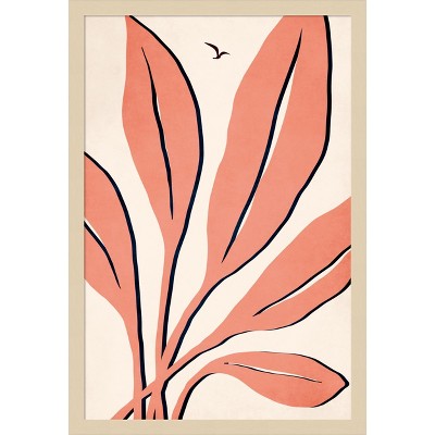 The artwork features a silhouetted bird in mid-flight set against a red circular backdrop, resembling a sun. Dark silhouetted leaves extend from the left of the composition, providing contrast against a light background. The minimalistic design emphasizes the elegance and freedom of nature. This framed art print was created by Eins Kubistika and printed by Amanti Art in Madison WI. The print is giclee printed using fade-resistant inks for picture-perfect detail and incredible depth of color and finished with a 100% real wood frame. Individually made using traditional custom framing techniques, it has the quality you would expect from your local frame shop.