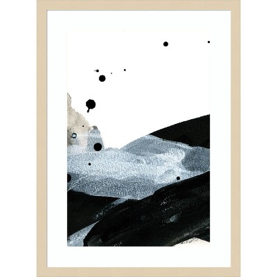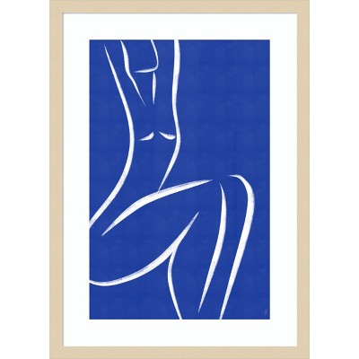 The image showcases an abstract, minimalist artwork. It features a monochromatic blue background with a simplistic, elegant white line drawing of a human figure in a seated, contemplative pose. This framed art print was created by Anne-marie Volfova and printed by Amanti Art in Madison WI. The print is giclee printed using fade-resistant inks for picture-perfect detail and incredible depth of color and finished with a 100% real wood frame. Individually made using traditional custom framing techniques, it has the quality you would expect from your local frame shop.