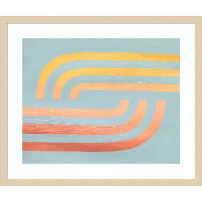 An abstract watercolor painting featuring a serene landscape. The artwork showcases a blend of soft pastel colors, including hues of orange, red, green, blue, and beige, creating a calming and modern aesthetic. The minimalistic design and gentle transitions between colors embody a sense of tranquility and nature. This framed art print was created by Jan Weiss and printed by Amanti Art in Madison WI. The print is giclee printed using fade-resistant inks for picture-perfect detail and incredible depth of color and finished with a 100% real wood frame. Individually made using traditional custom framing techniques, it has the quality you would expect from your local frame shop.