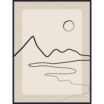 The artwork features a minimalist abstract landscape composed of simple black lines on a beige background. A large curve suggests mountains or hills, while a circle represents the sun in a clear sky. The composition is sleek and modern, emphasizing simplicity and form. This canvas art print was created by Elena Ristova and printed in Waunakee, WI. It is stretched across a solid surface to resist sagging. We use only premium, high-tension canvas. Our exclusive stretching techniques hide corner folds and provide a taut canvas surface. The artwork is authentically licensed. The canvas appears as if it is floating in the frame because it has a narrow gap between the edge of the canvas and the frame. Our canvas items are individually made using traditional custom framing techniques, it has the quality you would expect from your local frame shop.