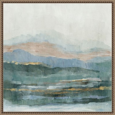 This artwork features softly layered mountains in muted tones, painted in a watercolor style. The scene is reflected below, creating a serene and balanced composition. The minimalist design conveys a sense of tranquility and simplicity. This canvas art print was created by Grace Popp and printed in Waunakee, WI. It is stretched across a solid surface to resist sagging. We use only premium, high-tension canvas. Our exclusive stretching techniques hide corner folds and provide a taut canvas surface. The artwork is authentically licensed. The canvas appears as if it is floating in the frame because it has a narrow gap between the edge of the canvas and the frame. Our canvas items are individually made using traditional custom framing techniques, it has the quality you would expect from your local frame shop.