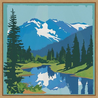 The artwork depicts a serene landscape featuring towering mountains reflected in a tranquil lake. Lush green pine trees line the shore, enhancing the natural beauty. The sky's vivid blue complements the green tones of the landscape, evoking a sense of peace. This canvas art print was created by Walker Noble and printed in Waunakee, WI. It is stretched across a solid surface to resist sagging. We use only premium, high-tension canvas. Our exclusive stretching techniques hide corner folds and provide a taut canvas surface. The artwork is authentically licensed. The canvas appears as if it is floating in the frame because it has a narrow gap between the edge of the canvas and the frame. Our canvas items are individually made using traditional custom framing techniques, it has the quality you would expect from your local frame shop.