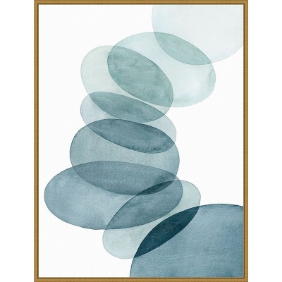 The artwork features an abstract geometric pattern with curving lines that form various shapes. The color palette includes shades of green, blue, and cream, evoking a sense of calm and earthiness. The composition is minimalist, emphasizing the flow and connection between the shapes. This canvas art print was created by Regina Moore and printed in Waunakee, WI. It is stretched across a solid surface to resist sagging. We use only premium, high-tension canvas. Our exclusive stretching techniques hide corner folds and provide a taut canvas surface. The artwork is authentically licensed. The canvas appears as if it is floating in the frame because it has a narrow gap between the edge of the canvas and the frame. Our canvas items are individually made using traditional custom framing techniques, it has the quality you would expect from your local frame shop.