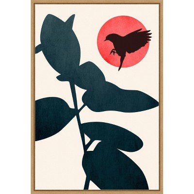 This artwork features the silhouette of large leaves against a warm, orange sunset. Black birds are seen flying in formation across the sky. The image conveys a sense of tranquility and connection to nature through its minimalistic style. This canvas art print was created by Eins Kubistika and printed in Waunakee, WI. It is stretched across a solid surface to resist sagging. We use only premium, high-tension canvas. Our exclusive stretching techniques hide corner folds and provide a taut canvas surface. The artwork is authentically licensed. The canvas appears as if it is floating in the frame because it has a narrow gap between the edge of the canvas and the frame. Our canvas items are individually made using traditional custom framing techniques, it has the quality you would expect from your local frame shop.