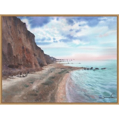 The image depicts a breathtaking view of Santorini, Greece, at sunset. Whitewashed buildings with blue accents cascade down towards the calm ocean, capturing the essence of Mediterranean architecture. The serene horizon and subtle lighting create an enchanting evening ambiance. This canvas art print was created by Bella Eve and printed in Waunakee, WI. It is stretched across a solid surface to resist sagging. We use only premium, high-tension canvas. Our exclusive stretching techniques hide corner folds and provide a taut canvas surface. The artwork is authentically licensed. The canvas appears as if it is floating in the frame because it has a narrow gap between the edge of the canvas and the frame. Our canvas items are individually made using traditional custom framing techniques, it has the quality you would expect from your local frame shop.