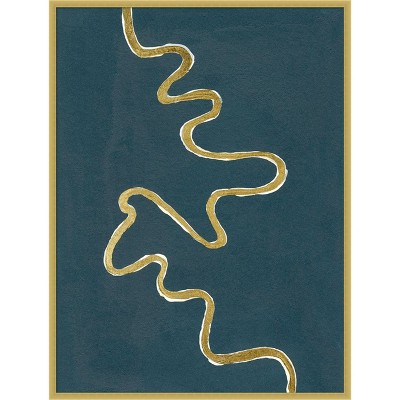 The artwork features a sinuous gold line flowing across a dark background. The minimalist design emphasizes elegance and simplicity, highlighting the contrast between the luminous line and the deep, textured backdrop. It evokes a sense of movement and fluidity. This framed art print was created by Michael Willett and printed by Amanti Art in Madison WI. The print is giclee printed using fade-resistant inks for picture-perfect detail and incredible depth of color and finished with a 100% real wood frame. Individually made using traditional custom framing techniques, it has the quality you would expect from your local frame shop.