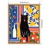 A black cat yawns prominently in the center of the artwork, surrounded by vibrant patterns. One side features floral motifs on a blue background, while the other is decorated with yellow lemons and blue leaves. The composition includes two simplified bottle shapes and a red background with white flowers. This canvas art print was created by Kintsugi99 and printed in Waunakee, WI. It is stretched across a solid surface to resist sagging. We use only premium, high-tension canvas. Our exclusive stretching techniques hide corner folds and provide a taut canvas surface. The artwork is authentically licensed. The canvas appears as if it is floating in the frame because it has a narrow gap between the edge of the canvas and the frame. Our canvas items are individually made using traditional custom framing techniques, it has the quality you would expect from your local frame shop.