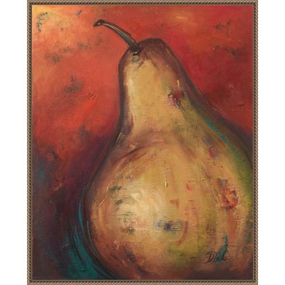 This image features a painting of a pear. The pear is depicted in warm, vibrant colors that emphasize its natural beauty. The style is impressionistic, with visible brush strokes that give the painting texture and depth. The background is a soft, muted color, which helps to highlight the pear as the focal point of the artwork. The leaves and stem provide additional detail, adding to the overall realism and charm of the piece. This framed art print was created by Danhui Nai and printed by Amanti Art in Madison WI. The print is giclee printed using fade-resistant inks for picture-perfect detail and incredible depth of color and finished with a 100% real wood frame. Individually made using traditional custom framing techniques, it has the quality you would expect from your local frame shop.