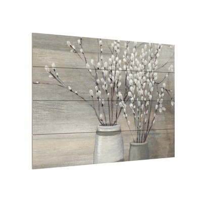 Silver vases with coordinating geometric patterns hold willow branches in bloom. The vases pick up a sheen from the light and throw weak shadows against a whitewashed plank wall, giving viewers a study in grey tones. This canvas art print was created by Julia Purinton and printed in Madison, WI. It is stretched across a solid surface to resist sagging. We use only premium, high-tension canvas. Our exclusive stretching techniques hide corner folds and provide a taut canvas surface. The artwork is authentically licensed. The canvas appears as if it is floating in the frame because it has a narrow gap between the edge of the canvas and the frame. Our canvas items are individually made using traditional custom framing techniques, it has the quality you would expect from your local frame shop.