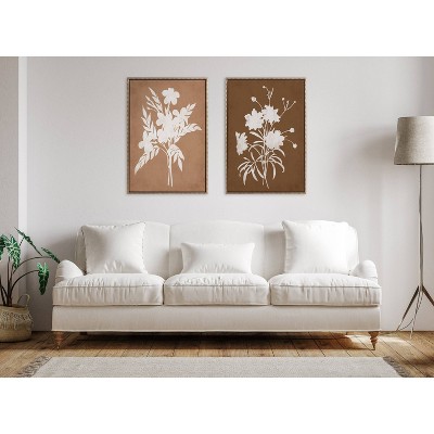 The image showcases a delicate watercolor painting of a botanical subject. It features detailed leaves and blossoming white flowers on a beige background. The artwork has a graceful and serene aesthetic, with neutral colors complementing the intricate leaf and flower patterns. This canvas art print was created by Grace Popp and printed in Waunakee, WI. The canvas is stretched by hand and finished with a float frame. Individually made using traditional custom framing techniques, it has the quality you would expect from your local frame shop.