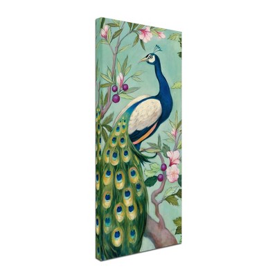 This artwork features a white peacock painted against a rich blue background. The detailed feathers and elegant posture of the bird highlight its grace and majesty. The contrast between the white feathers and deep blue background creates a striking visual effect. This canvas art print was created by Grace Popp and printed in Waunakee, WI. It is stretched across a solid surface to resist sagging. We use only premium, high-tension canvas. Our exclusive stretching techniques hide corner folds and provide a taut canvas surface. The artwork is authentically licensed. The canvas appears as if it is floating in the frame because it has a narrow gap between the edge of the canvas and the frame. Our canvas items are individually made using traditional custom framing techniques, it has the quality you would expect from your local frame shop.