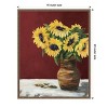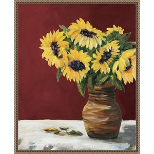 This artwork showcases vibrant sunflowers in full bloom atop a maroon backdrop. The floral arrangement exudes a sense of warmth and beauty, capturing the essence of nature\'s delicate balance. This canvas art print was created by Julie Derice and printed in Madison, WI. It is stretched across a solid surface to resist sagging. We use only premium, high-tension canvas. Our exclusive stretching techniques hide corner folds and provide a taut canvas surface. The artwork is authentically licensed. The canvas appears as if it is floating in the frame because it has a narrow gap between the edge of the canvas and the frame. Our canvas items are individually made using traditional custom framing techniques, it has the quality you would expect from your local frame shop.