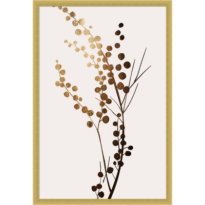The artwork features a combination of abstract geometric and organic shapes, using a warm color palette. It includes a bold yellow shape, complemented by black leaf-like elements, and an arc at the bottom. Lines add texture and depth to the composition, creating a harmonious balance. This framed art print was created by Eins Kubistika and printed by Amanti Art in Madison WI. The print is giclee printed using fade-resistant inks for picture-perfect detail and incredible depth of color and finished with a 100% real wood frame. Individually made using traditional custom framing techniques, it has the quality you would expect from your local frame shop.