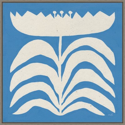 This image features a botanical art print in indigo hues, depicting intricate floral designs with delicate leaves and flowers on a textured, off-white background. The composition is symmetrical and evokes a traditional, vintage style ideal for interior decor. This framed art print was created by Cheri Blum and printed by Amanti Art in Madison WI. The print is giclee printed using fade-resistant inks for picture-perfect detail and incredible depth of color and finished with a 100% real wood frame. Individually made using traditional custom framing techniques, it has the quality you would expect from your local frame shop.