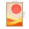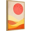 This artwork features a minimalist depiction of a desert landscape with rolling orange and yellow dunes. Above the dunes, a large red sun dominates the sky, emphasized by the silhouettes of several birds flying across. The composition uses bold, warm colors to create a serene and abstract representation of nature. This canvas art print was created by Eins Kubistika and printed in Waunakee, WI. It is stretched across a solid surface to resist sagging. We use only premium, high-tension canvas. Our exclusive stretching techniques hide corner folds and provide a taut canvas surface. The artwork is authentically licensed. The canvas appears as if it is floating in the frame because it has a narrow gap between the edge of the canvas and the frame. Our canvas items are individually made using traditional custom framing techniques, it has the quality you would expect from your local frame shop.