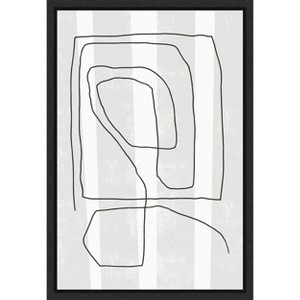 The artwork features a series of black, freeform lines that create a geometric, abstract pattern against a light gray background. The monochrome design emphasizes simplicity and structural forms. Vertical stripes in the background add depth and texture to the minimalist composition. This canvas art print was created by Uplusmestudio and printed in Waunakee, WI. It is stretched across a solid surface to resist sagging. We use only premium, high-tension canvas. Our exclusive stretching techniques hide corner folds and provide a taut canvas surface. The artwork is authentically licensed. The canvas appears as if it is floating in the frame because it has a narrow gap between the edge of the canvas and the frame. Our canvas items are individually made using traditional custom framing techniques, it has the quality you would expect from your local frame shop.