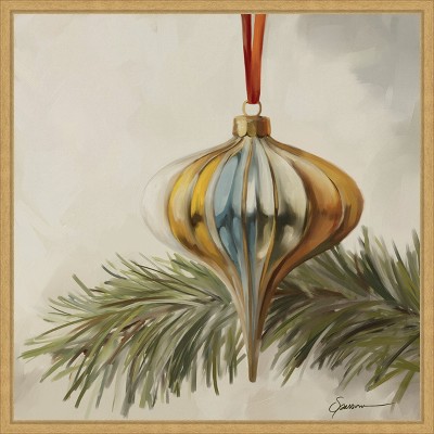 The image features a festive holiday scene with a nutcracker figure, Christmas ornaments, and a beautifully wrapped red gift with a white ribbon. Sprigs of pine add a touch of greenery to the composition. The overall atmosphere evokes warmth and holiday cheer. This canvas art print was created by Mary Sparrow and printed in Waunakee, WI. It is stretched across a solid surface to resist sagging. We use only premium, high-tension canvas. Our exclusive stretching techniques hide corner folds and provide a taut canvas surface. The artwork is authentically licensed. The canvas appears as if it is floating in the frame because it has a narrow gap between the edge of the canvas and the frame. Our canvas items are individually made using traditional custom framing techniques, it has the quality you would expect from your local frame shop.