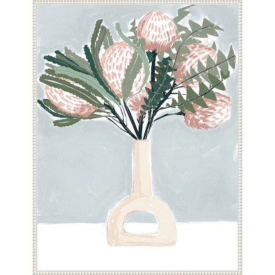 This artwork showcases a vibrant arrangement of flowers in a simple pink vase. The floral elements bring life and color to the composition, highlighting the elegance and charm of the bouquet. This canvas art print was created by Incado and printed in Madison, WI. It is stretched across a solid surface to resist sagging. We use only premium, high-tension canvas. Our exclusive stretching techniques hide corner folds and provide a taut canvas surface. The artwork is authentically licensed. The canvas appears as if it is floating in the frame because it has a narrow gap between the edge of the canvas and the frame. Our canvas items are individually made using traditional custom framing techniques, it has the quality you would expect from your local frame shop.
