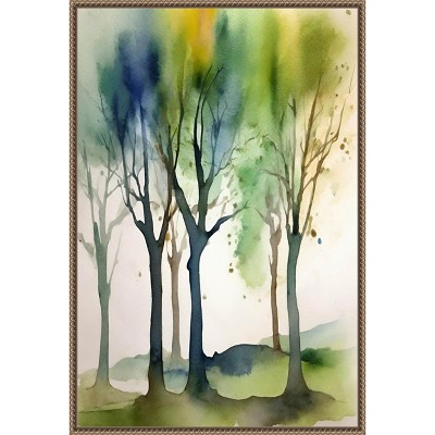 The image depicts a serene landscape featuring a group of trees rendered in watercolor. The trees have a soft, abstract appearance with hues of green, blue, and hints of yellow blending seamlessly. The muted background enhances the sense of tranquility and natural beauty, giving the piece an overall calming effect. This canvas art print was created by Sally Ann Moss and printed in Waunakee, WI. It is stretched across a solid surface to resist sagging. We use only premium, high-tension canvas. Our exclusive stretching techniques hide corner folds and provide a taut canvas surface. The artwork is authentically licensed. The canvas appears as if it is floating in the frame because it has a narrow gap between the edge of the canvas and the frame. Our canvas items are individually made using traditional custom framing techniques, it has the quality you would expect from your local frame shop.