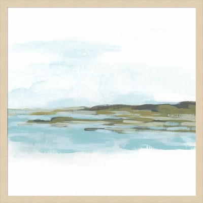 This artwork captures the rugged beauty of a coastal landscape with crashing waves and rocky cliffs. The sea is painted in vibrant blue hues, contrasting with the earthy tones of the cliffs and sandy shore. The sky is a soft blend of pale colors, suggesting a serene, overcast day. This framed art print was created by Maya Woods and printed by Amanti Art in Madison WI. The print is giclee printed using fade-resistant inks for picture-perfect detail and incredible depth of color and finished with a 100% real wood frame. Individually made using traditional custom framing techniques, it has the quality you would expect from your local frame shop.