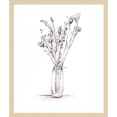 The image is a pencil sketch of a vase filled with long-stemmed flowers. The art showcases delicate line work capturing the intricate details of the blooms and leaves. The monochromatic style emphasizes the simplicity and elegance of the natural subject. This framed art print was created by Ethan Harper and printed by Amanti Art in Madison WI. The print is giclee printed using fade-resistant inks for picture-perfect detail and incredible depth of color and finished with a 100% real wood frame. Individually made using traditional custom framing techniques, it has the quality you would expect from your local frame shop.