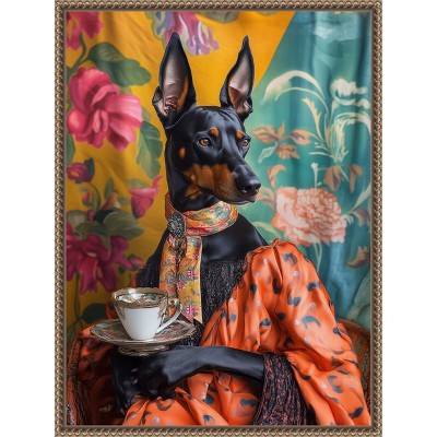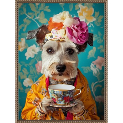 A small dog is dressed in an ornate floral outfit with a matching floral headpiece, holding a teacup. The background is a lively floral pattern that complements the dog's attire. The artwork is full of whimsy and charm, merging elegance with playful creativity. This canvas art print was created by Mowzu and printed in Waunakee, WI. It is stretched across a solid surface to resist sagging. We use only premium, high-tension canvas. Our exclusive stretching techniques hide corner folds and provide a taut canvas surface. The artwork is authentically licensed. The canvas appears as if it is floating in the frame because it has a narrow gap between the edge of the canvas and the frame. Our canvas items are individually made using traditional custom framing techniques, it has the quality you would expect from your local frame shop.