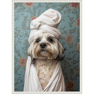 A small dog is dressed in an ornate floral outfit with a matching floral headpiece, holding a teacup. The background is a lively floral pattern that complements the dog's attire. The artwork is full of whimsy and charm, merging elegance with playful creativity. This canvas art print was created by Mowzu and printed in Waunakee, WI. It is stretched across a solid surface to resist sagging. We use only premium, high-tension canvas. Our exclusive stretching techniques hide corner folds and provide a taut canvas surface. The artwork is authentically licensed. The canvas appears as if it is floating in the frame because it has a narrow gap between the edge of the canvas and the frame. Our canvas items are individually made using traditional custom framing techniques, it has the quality you would expect from your local frame shop.