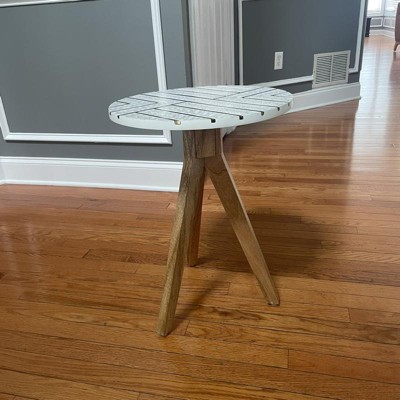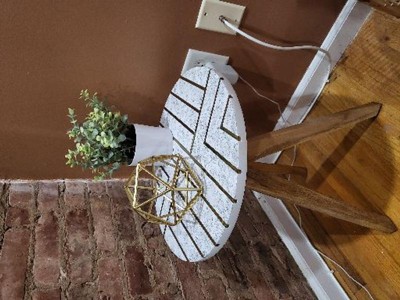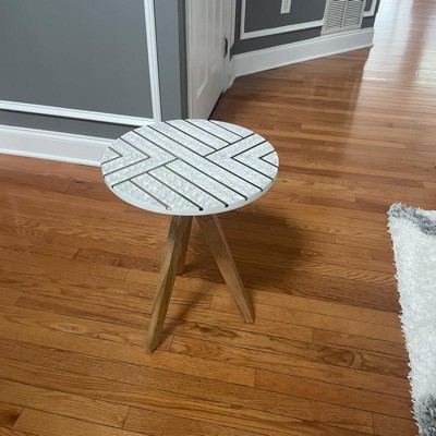 This round accent table is the perfect answer for small living spaces. Everyone can use an extra table around the holidays or for unexpected guests, but when space is the issue, this small end table is a welcome choice. The white and brass inlay tabletop is a sure sign of excellence. The solid wood legs have a pleasing design that never goes out of style. This foolproof side table for small spaces can hold drinks for your guests and display your favorite table lamp and living room decor. This modern-looking side table has a space-saving design every homeowner will appreciate.